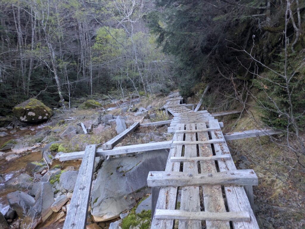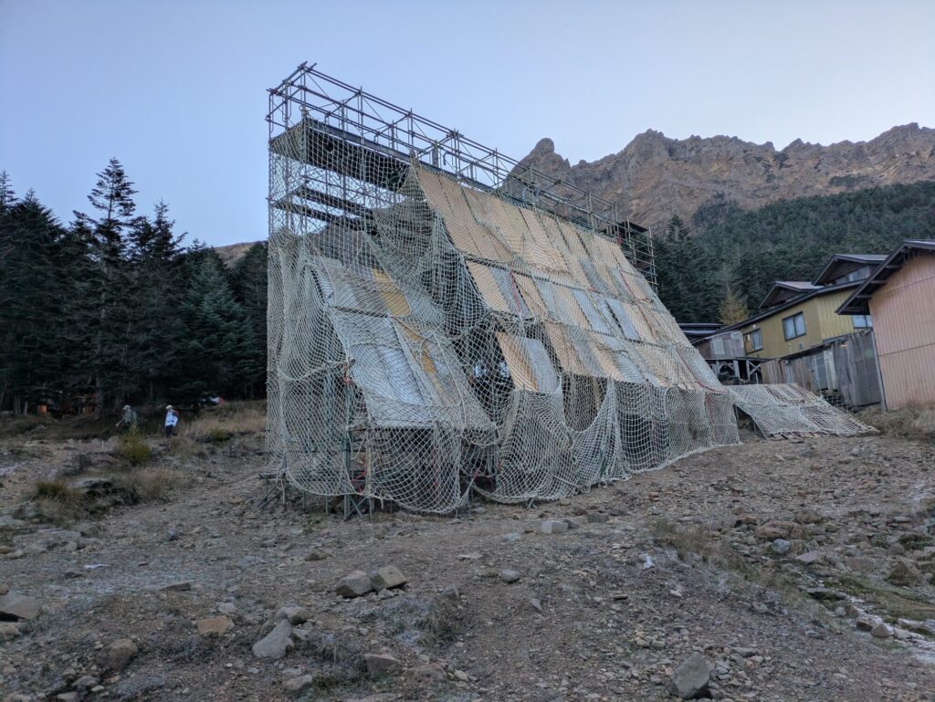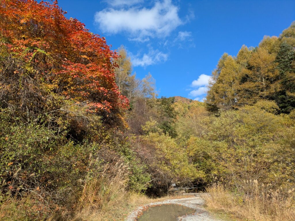 最終日は赤岳鉱泉から北沢を経由して美濃戸口へ下山します。赤岳鉱泉では冬のアイスウォール造りにそなえて櫓が設置され、冬支度は万全のように見えました。私たちは何度も渓流にかかる木橋を渡りながら下山します。林道に出会うとそこからはカラマツの黄金色の黄葉、カエデの赤い紅葉などを楽しみながら歩きます。