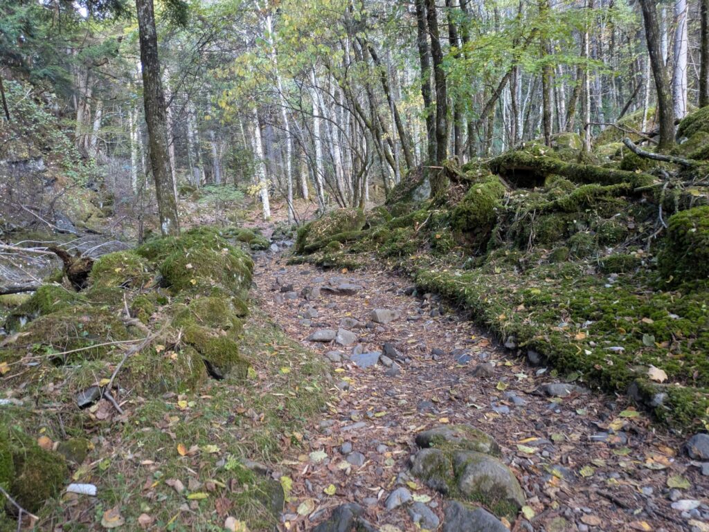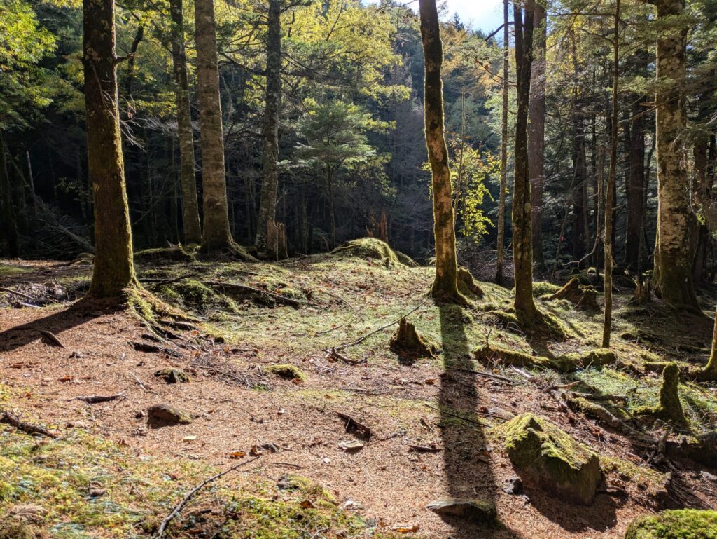 午後の傾斜がついた光線が苔の森を美しく照らします。しかしながら日没も近い晩秋につき、のんびりじっくり鑑賞することもできず、本日の宿舎である行者小屋を目指して先を急ぎました。