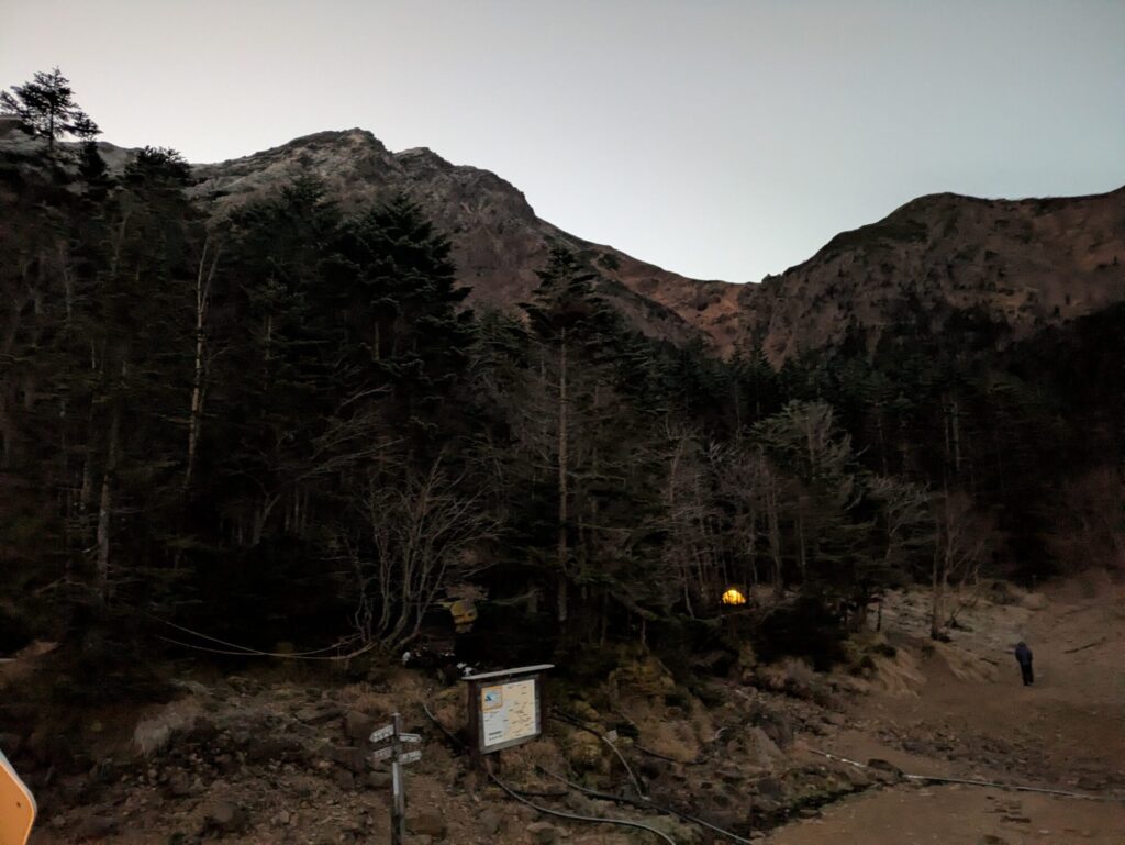 行者小屋に到着したのは日没直前。ヘッドランプは使わなくても歩くことができましたが、高速道の渋滞などもありぎりぎりの到着となってしまいました。本日の宿泊者は少なく、我々を入れて10名ほど。広々とスペースを使わせてもらうことができました。2Fの居室にはこたつもあり、ゆっくりとくつろぐことができました。夕食はとってもおいしい煮込みハンバーグ御膳でした。