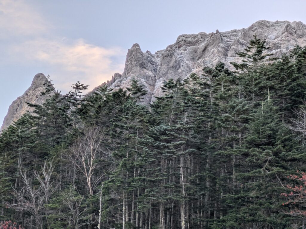 出発前日までは日本列島を発達する低気圧が通過して各地で荒れた天候となりましたが、出発当日は徐々に天候が回復。登山口の美濃戸口を午後に出発する頃には晴天となりました。山裾の紅葉もピークに向かっているようでした。