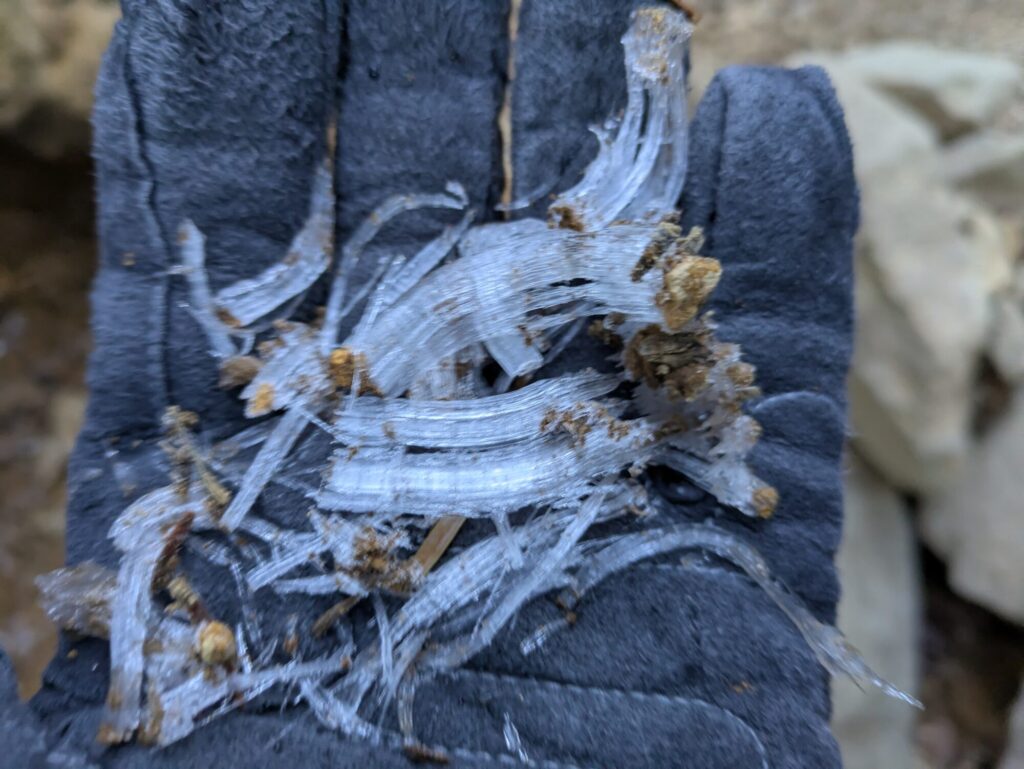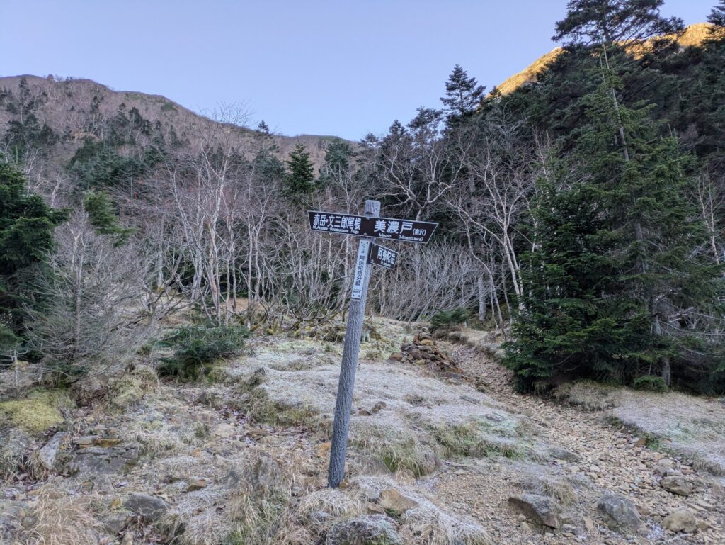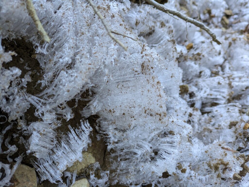 身支度を整えて出発。行者小屋から地蔵尾根を使って登る予定にしていましたが、強風が予想されるためより風の当たりにくい文三郎尾根から登ります。樹林帯の地面は固く凍結し、今シーズン初めての霜柱を見ることができました。