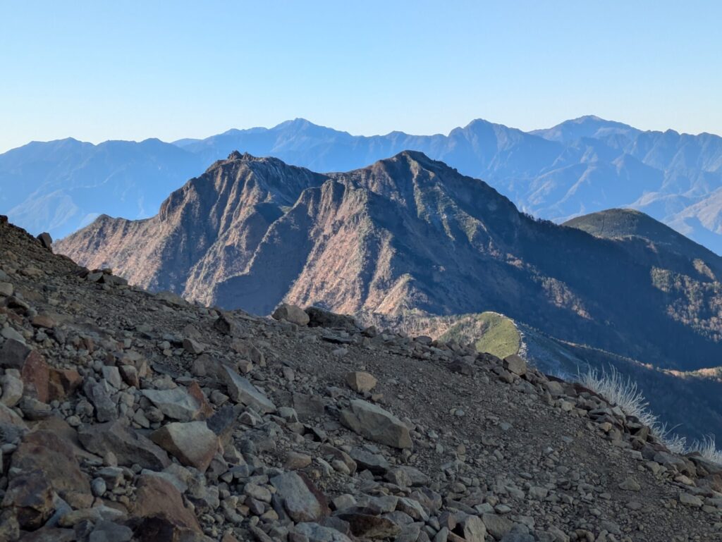 八ヶ岳赤岳の稜線からキレットと権現岳/奥に南アルプスを眺める