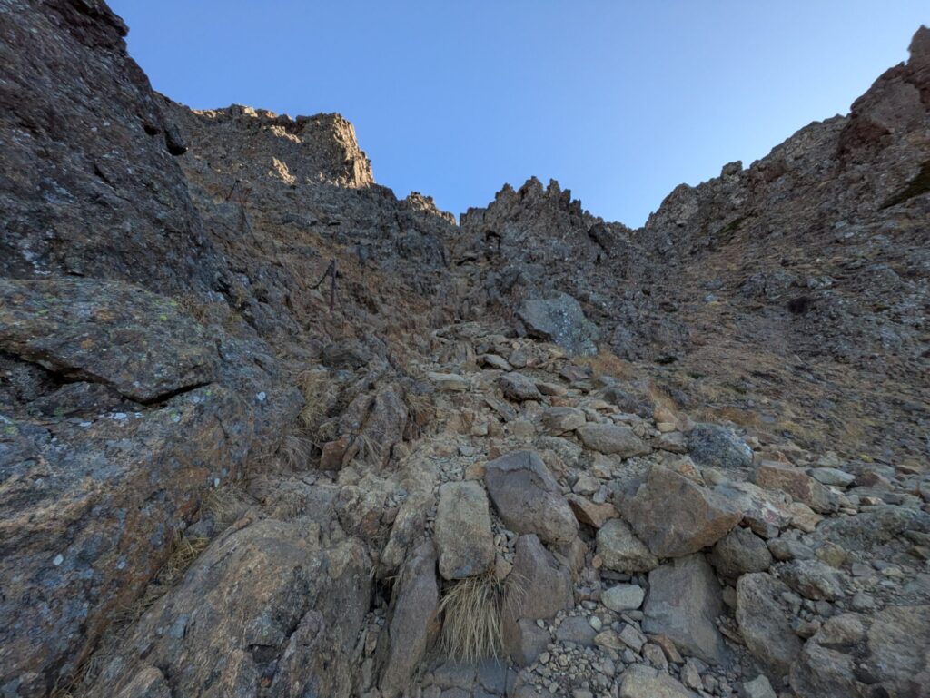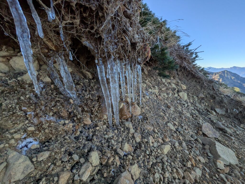 稜線の斜面に成長したつららを見ながら、つめたく冷え切った岩場を慎重に登ります。