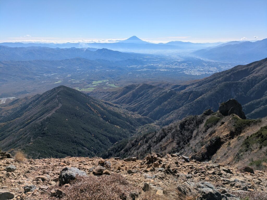 山頂直下のテラスに出ると正面に白い衣をまとった富士山が正面に、周囲に丹沢や御坂山地、奥秩父の山々までずらりと見渡すことができます。素晴らしいの一言、しばらく時間を取って絶景を楽しみました。