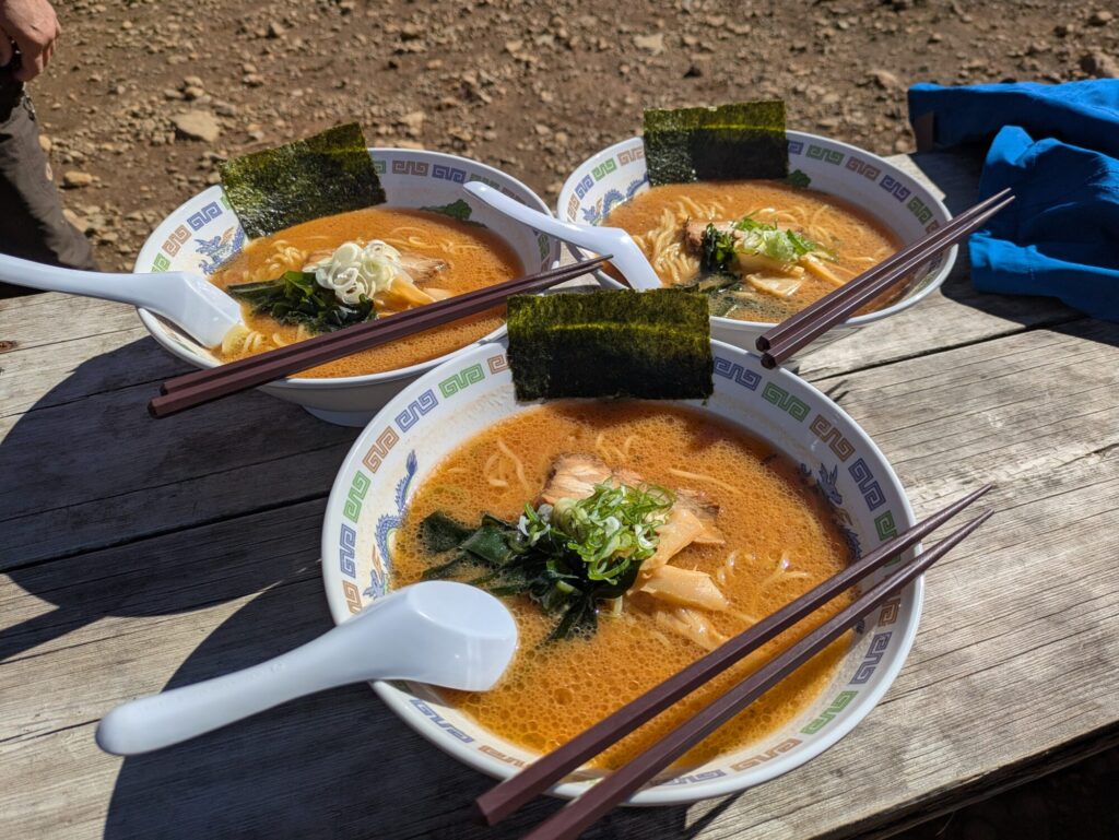 行者小屋に到着すると稜線の風はうそのように穏やかな気候。ちょうどお昼時なのでラーメンをいただきました。快晴の小屋前で絶景を眺めながらいただくラーメンは絶品!ゆっくりと休憩を取って、次は赤岳鉱泉へ向けて出発。
