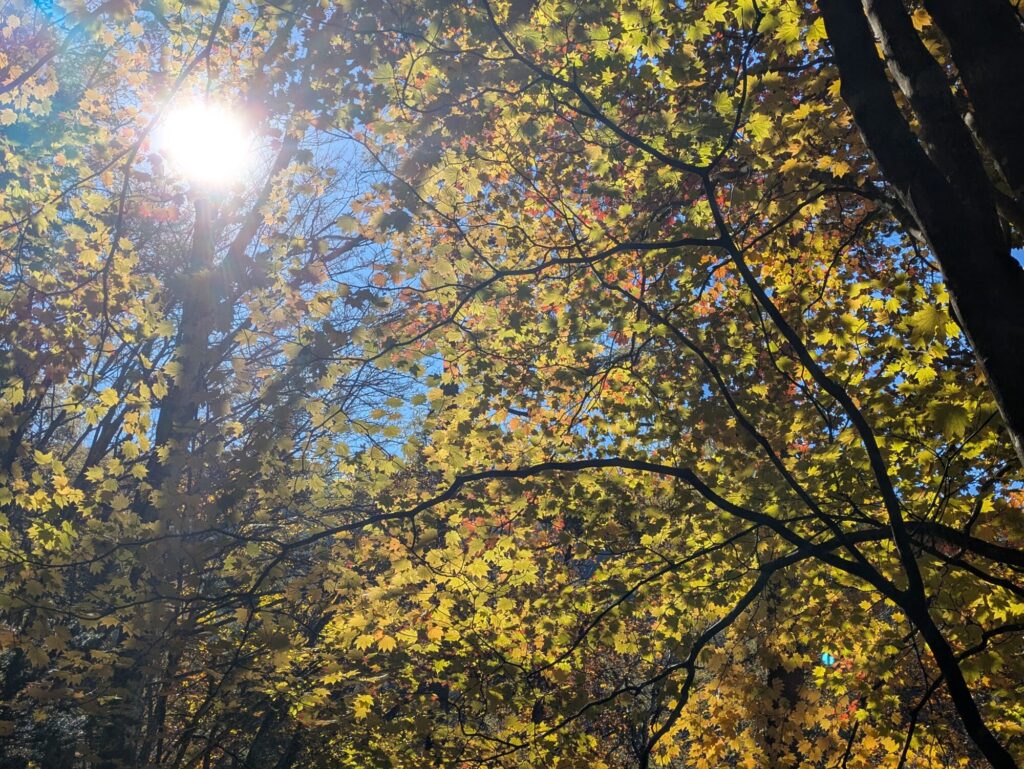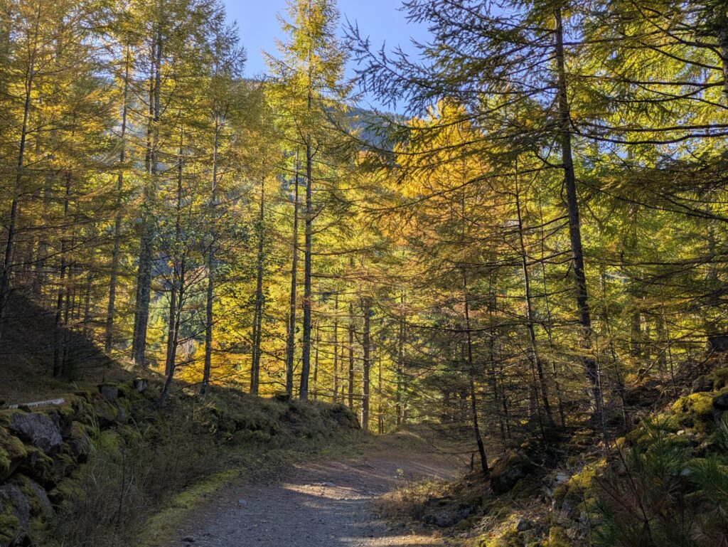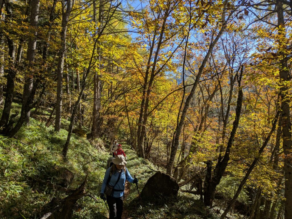 素晴らしい紅葉の中をゆったりと歩いて下山。紅葉美の中でとても気持ちのいい歩行です。計画を変更しても、また違う楽しみを見つけられることはとても大事なことだと思います。