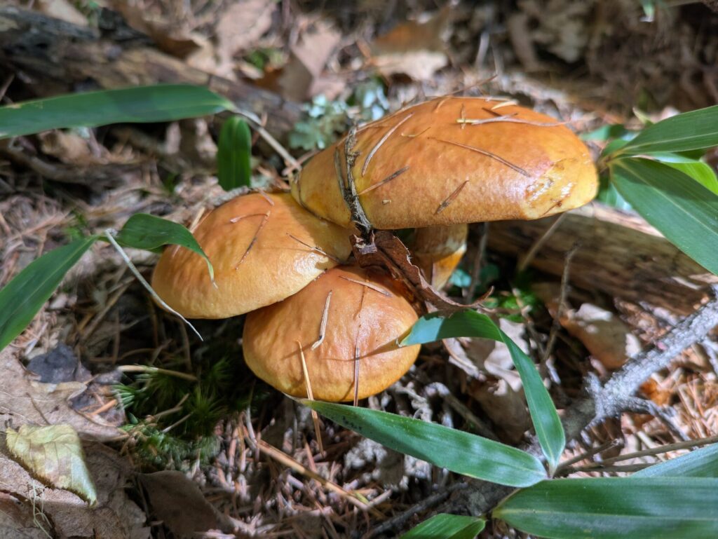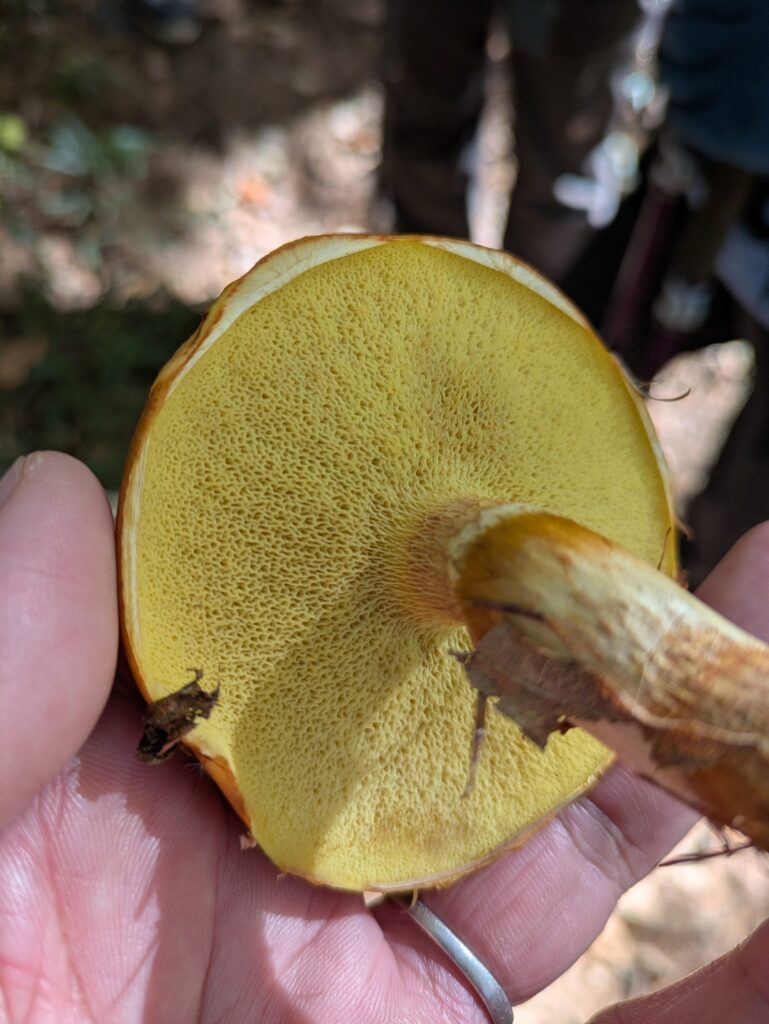 林床にはいかにもおいしそうなキノコがちらほら。こちらは傘の裏側がスポンジ状の特徴を持つイグチ科のきのこだと思われます。見たところ有名な食用きのこであるヤマドリタケに似ていますが、数年前からきのこ勉強中のため真偽はわかりません。