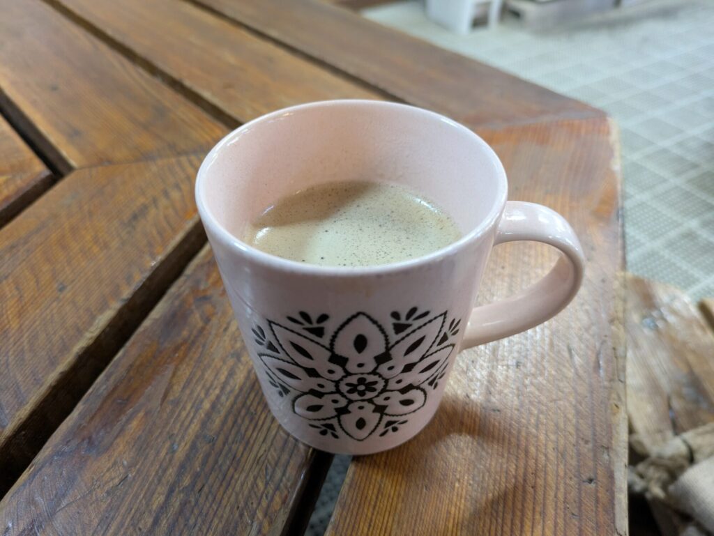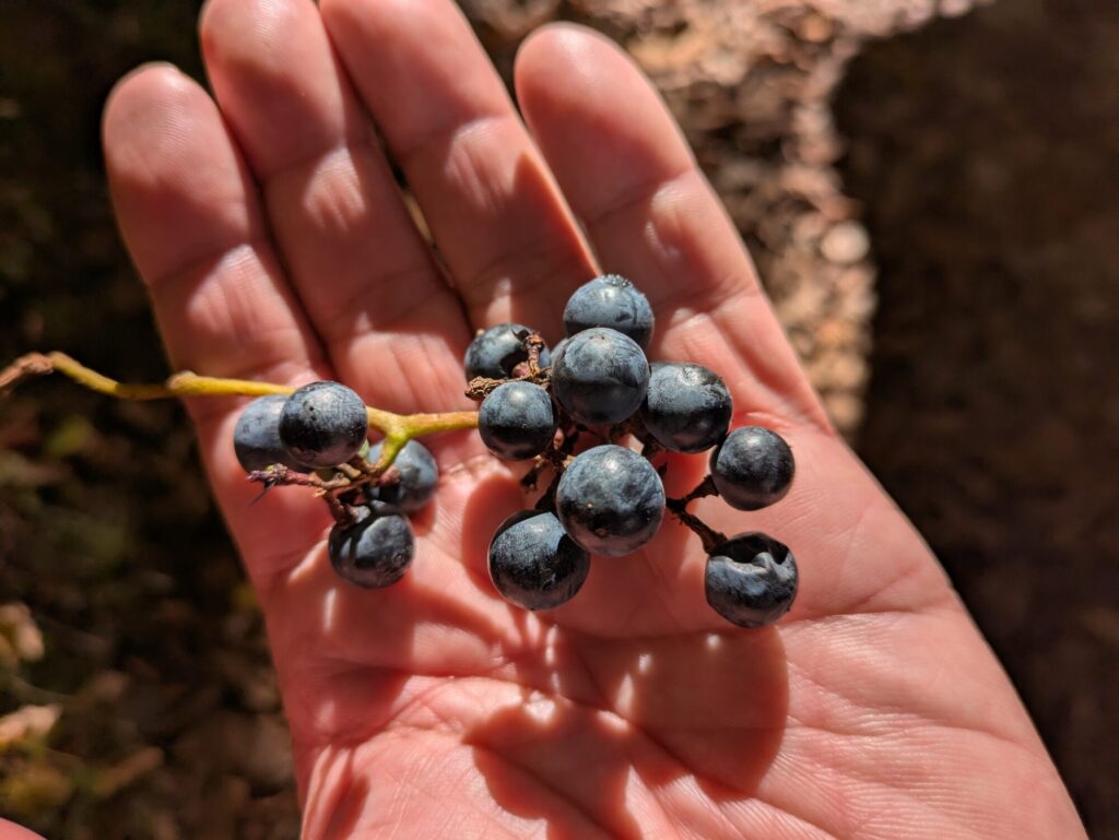 下山途中の林道では大きな赤い葉っぱがたくさん落ちていて、ヤマブドウが残っていないかとずっと捜し歩いていたら、ひと房だけ見つけることができました。一粒いただくと野生の甘味と酸味が口いっぱいに広がります。残りは野生動物のためにもとにあった場所へ。下山が完了した美濃戸口の八ヶ岳山荘ではモーニングコーヒーをいただいてほっと一息。予定より早い下山となったため、諏訪湖近辺の観光へ出発です。