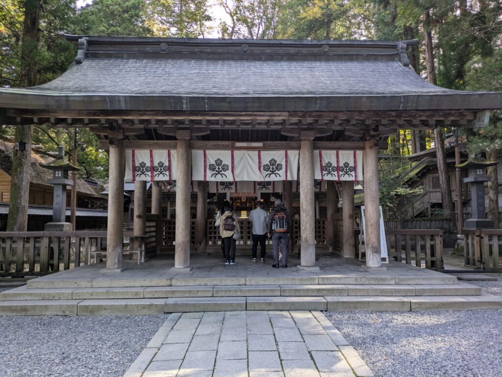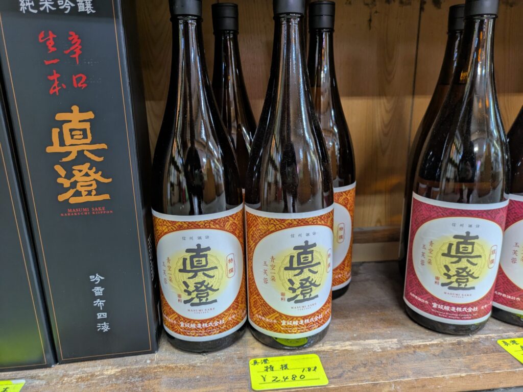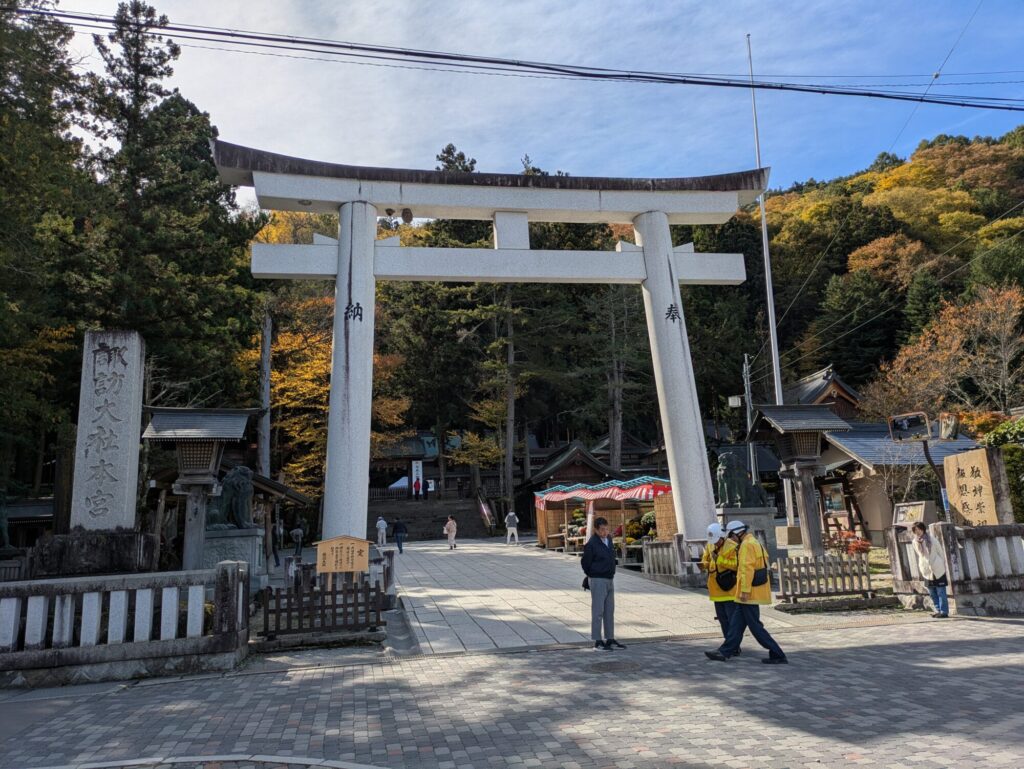 まずは信濃国の一之宮・諏訪大社本宮へ。全国に一万社以上ある諏訪神社の総本宮で、勇壮な御柱祭りで有名ですね。境内には過去に祭りに使った御柱が立てられています。そして諏訪の銘酒といえば、諏訪大社のご宝鏡を名前に冠する真澄です。日本酒好きメンバーである我々がこれを看過・素通りすることはできず、それぞれに複数買い求め、諏訪大社直前のひなびた土産物店は一時の好況に沸きました。