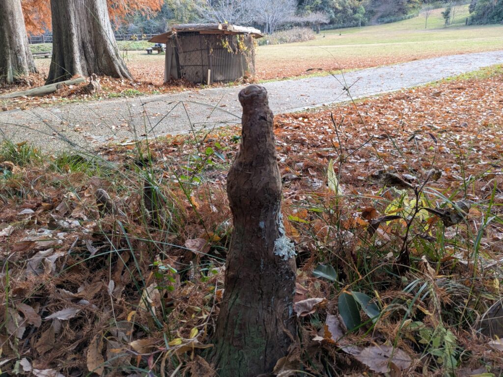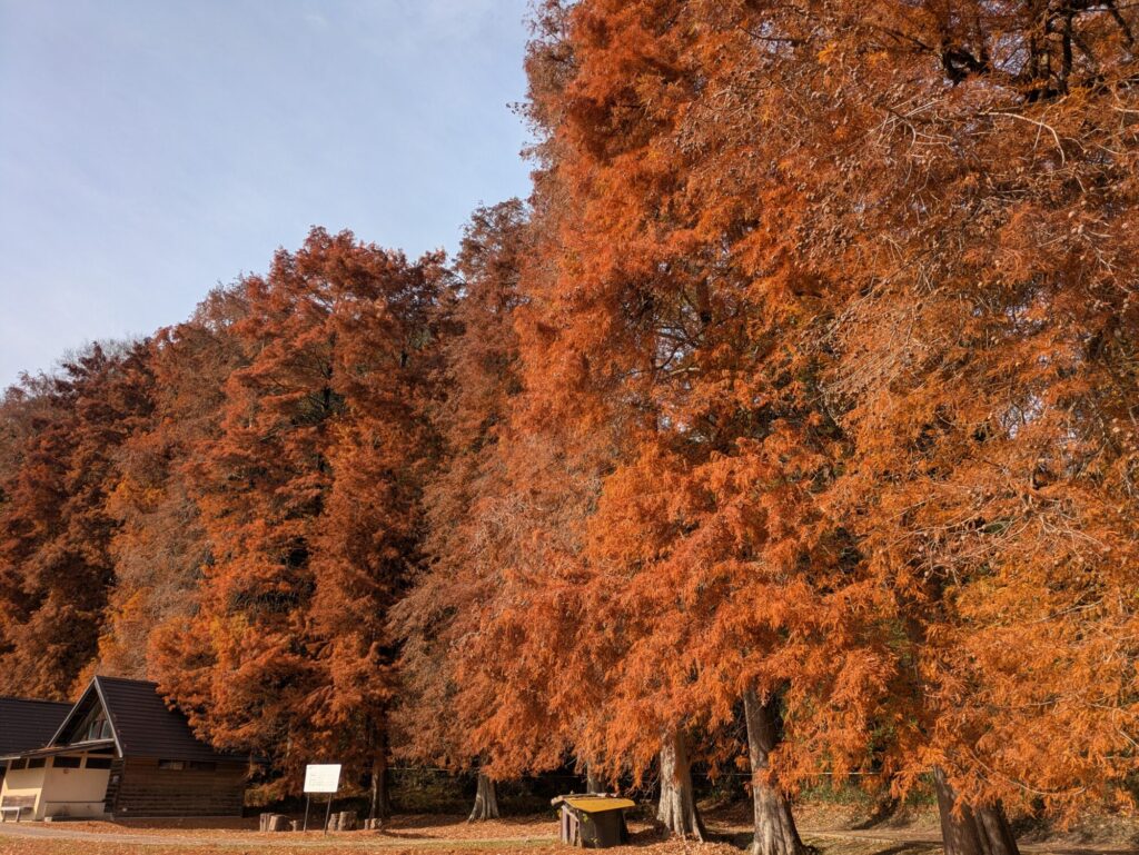 公園に入るとすぐに目につく巨木がラクウショウです。漢字で書くと落羽松。葉が紅葉して落ちるのでラクウショウという名前が付きました。アメリカ南東部から中米メキシコ付近が原産地で別名が沼杉とも言います。その名の通り湿地や沼沢地など水辺に分布できるのが強みで、高さは40~50mにもなり樹齢も2000年以上になるものがあるという長寿の木となります。