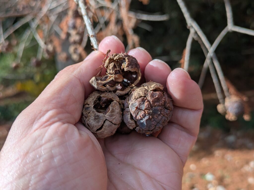 ラクウショウの実はピンポン玉やゴルフボールくらいの大きさがあり、中の実には油分が多く含まれヒノキのような香りがあるので、香り袋に使われることもあります。しかし油分が多いのでしみだして汚れることがある位だと言われます。