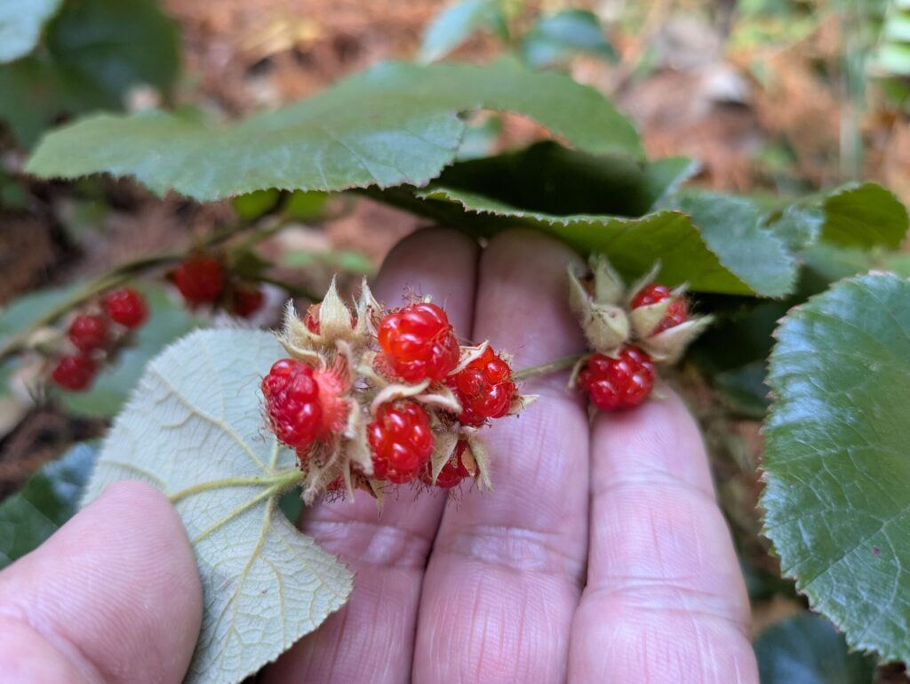 初冬の森を眺めながら昼食をいただきます。ぽかぽか陽気の中でいただく贅沢なランチ。林床を見ると今が旬のフユイチゴが実っていて、口に入れるとほのかな甘みを楽しむことができました。