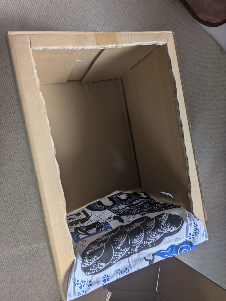最後に真ん中を仕切る手ぬぐいをホチキスで留めて完成です。敷料としてのもみ殻なども手に入れていますので、あとはひよこの誕生を待つのみ。果たして10個中いくつの卵が孵化するか、あと少しの時間を楽しみに待ちたいと思います。